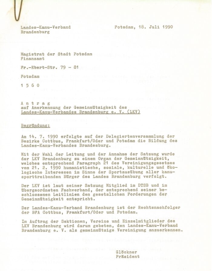© LKV Brandenburg I Antrag auf Gemeinnützigkeit mit Verweis auf die erfolgte Delegiertenversammlung am 14.07.1990.