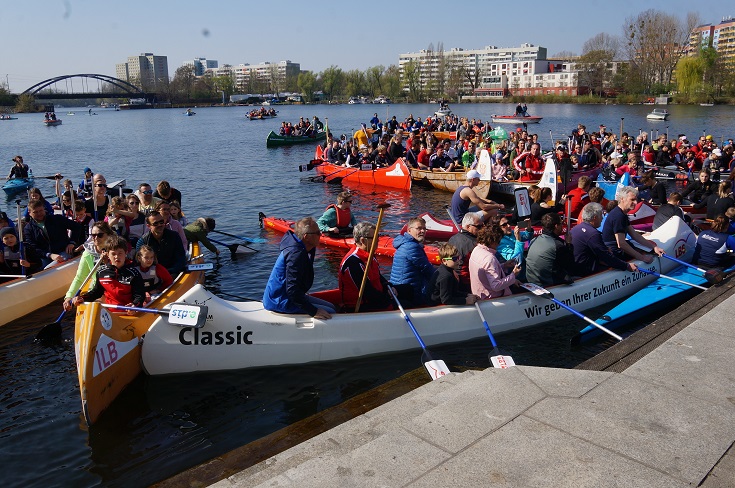Seit 2004 wird die bereits zur Tradition gewordene Veranstaltung jährlich am ersten Aprilwochenende auf dem Havelgewässer vor der Gaststätte „Seerose“ in der Potsdamer Innenstadt durchgeführt. Die LKV-Präsidentin bedauerte sehr, dass der jetzt 82-jährige Initiator dieses Potsdamer Events, Jürgen Poitzsch von den Wassersportfreunden Pirschheide, der mit seinen zehntausenden gepaddelten „Wanderkilometern“ auf zahlreichen Gewässern Deutschlands und darüber hinaus auch europaweit und auf dem Yukon in Nordamerika als einer der aktivsten Kanuwandersportler gilt, nicht dabei sein konnte. Zumal die mit nahezu 250 Paddlern jeglichen Alters besetzten etwa einhundert muskelbetriebenen Wasserfahrzeuge – angefangen vom Stand Up Paddling über die Renn-, Polo- und Wanderboote bis zum Drachenboot – wiederum ein bunt bewegtes Bild in die Havelbucht zauberten.