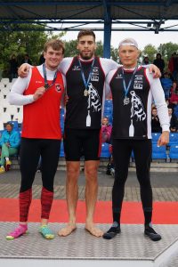 © Günter Welke |Leistungsklasse: Tibor Gescö siegt vor Gregor Rosenhahn| Tibor Gescö (mitte) mit Gregor Rosenhahn (rechts) bei der Siegerehrung im K1 über 1000 m