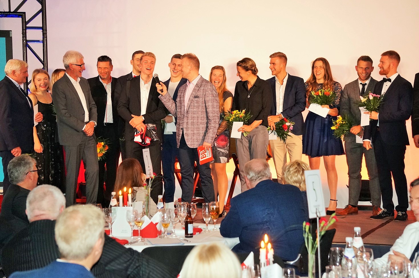Nebenbei ließ der Moderator auch einige der Ausgezeichneten zu Wort kommen, um deren Sichtweise auf das sportliche Geschehen der letzten Wettkampfsaison und der bevorstehenden Anforderungen zu übermitteln. Der erst vor wenigen Wochen zum Zweck seiner persönlichen kontinuierlichen Weiterentwicklung von Berlin-Köpenick zum KC Potsdam gewechselte Kajakfahrer Jacob Schopf erhielt, nachdem er von Andreas Gerlach zu seinem Entschluss begrüßt wurde, von den Anwesenden besonders herzlichen Beifall für seine offene Argumentation. „Man sollte kommen, wenn es am Schönsten ist“ und „Dem Wechsel nach Potsdam lag meine eigene Entscheidung zugrunde“, waren einige seiner an den nachfragenden Moderator gerichteten Worte. Andererseits betonte ebenso der im Vorjahr aufgrund besserer Trainingsbedingungen aus Mannheim-Sandhofen nach Potsdam verzogene Max Lemke: „Ich habe bisher nicht bereut, hierhergekommen zu sein.“