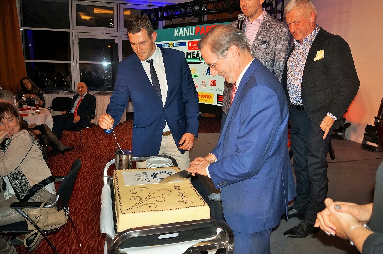 © Günter Welke I Matthias Platzeck und Sebastian Brendel beim Anschnitt der Kanu-Torte.